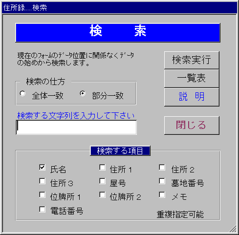検索する項目に、氏名、住所1−3、メモを設定できます。オプションボタンがチェックされてる項目で検索します。