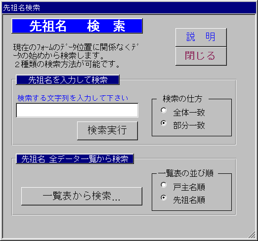 目的に応じて検索方法2種類を使い分けて下さい。詳しくは説明ボタンにて説明をご覧下さい。