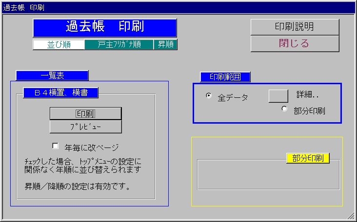過去帳トップメニューで選択した並び順に従って、過去帳データを印刷します。