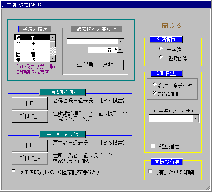 住所録+過去帳の全入力データが戸主毎に印刷されます。