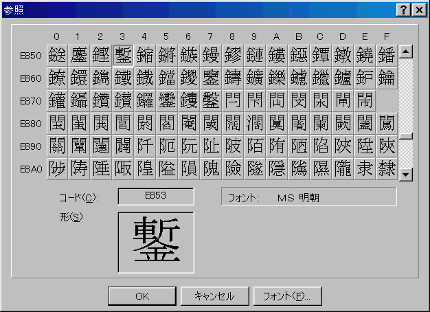 フォント名を「MS 明朝」にして、「鏨」を選択したところ