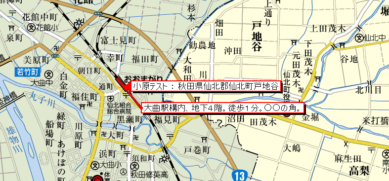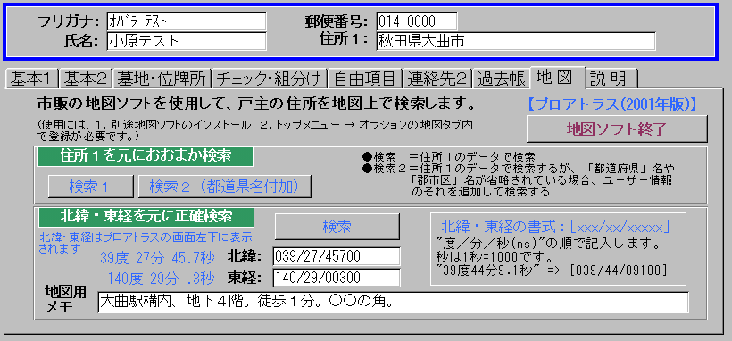 市販の地図ソフトを使用して、檀家管理から地図情報を表示させることが出来ます。 (現在は、地図ソフト「プロアトラス」にのみ対応) ●住所録の地図データ情報を入力している所 ●上記データを元に地図ソフトを起動させた状態 地図データを入力すると、「検索」ボタンを押すだけで、地図ソフトが起動し上記の状態になります。 (表示される地図は、地域によりその縮図の度合いが違います。)